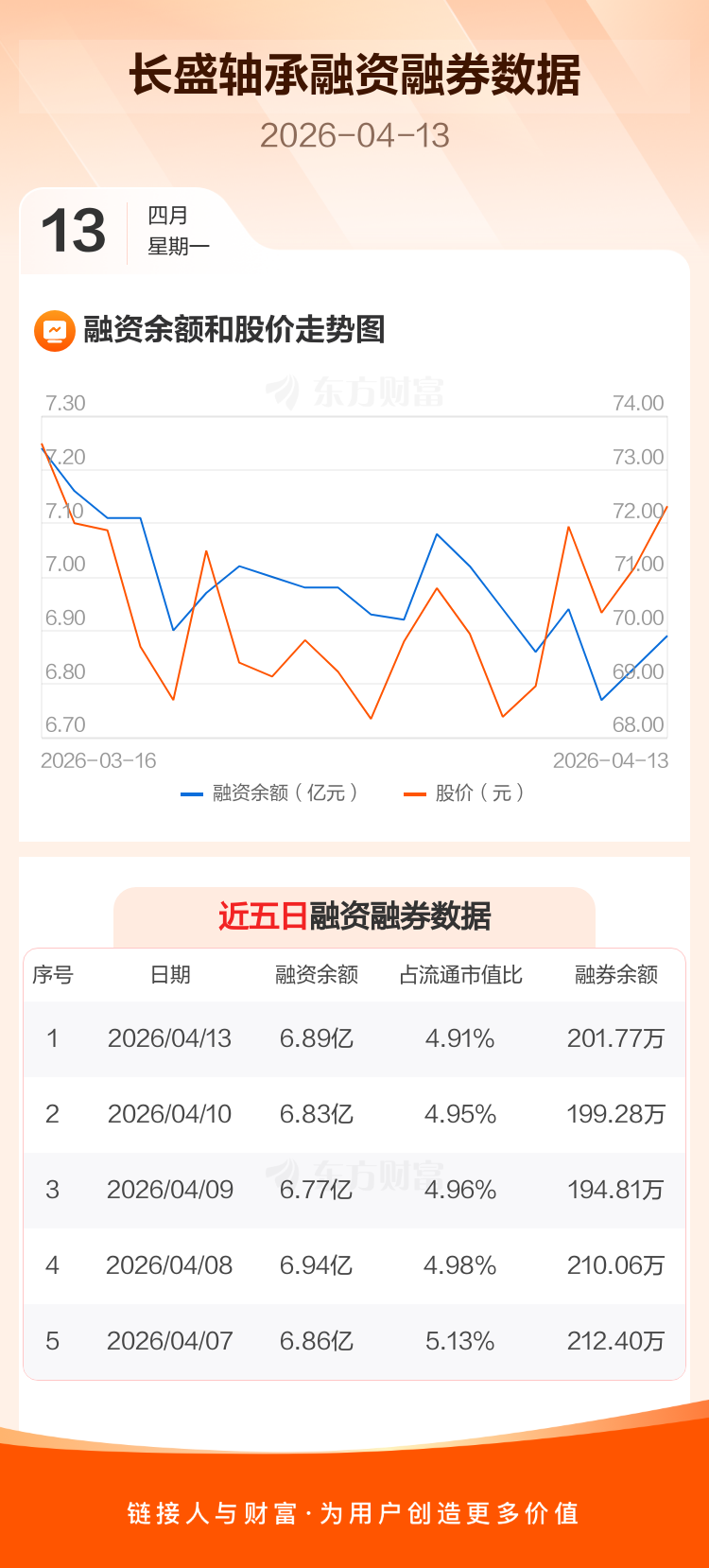 交易所最新数据显示,长盛轴承于2026年4月13日获融资买入3274.99万元,融资偿还2744.30万元,当日融资净买入530.69万元。目前,该股融资余额6.89亿,占流通市值比例为4.91%。