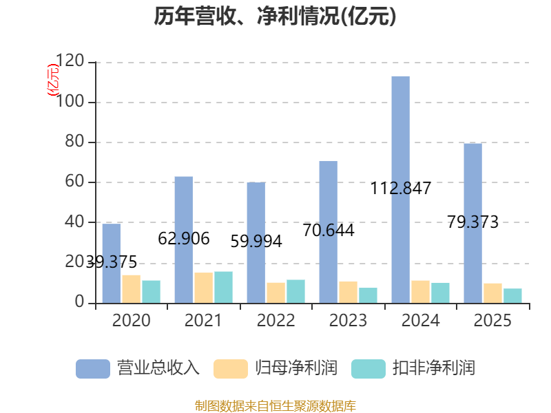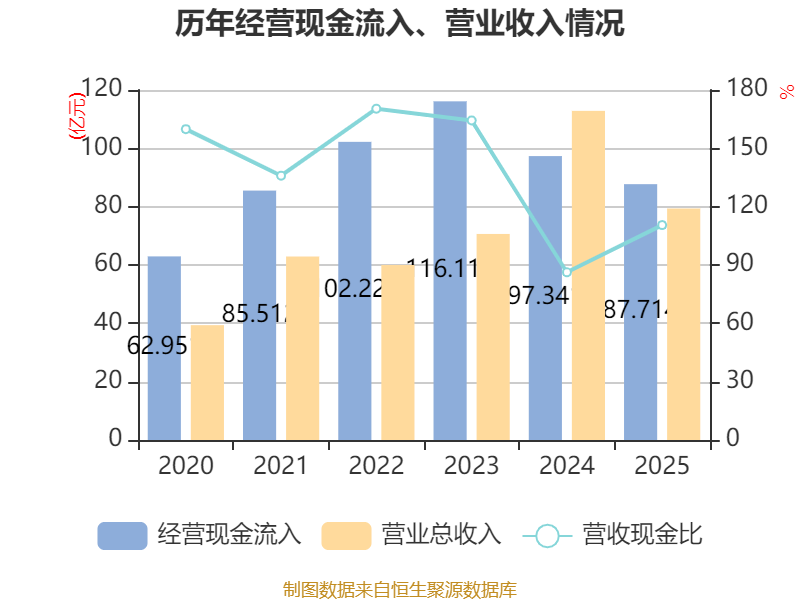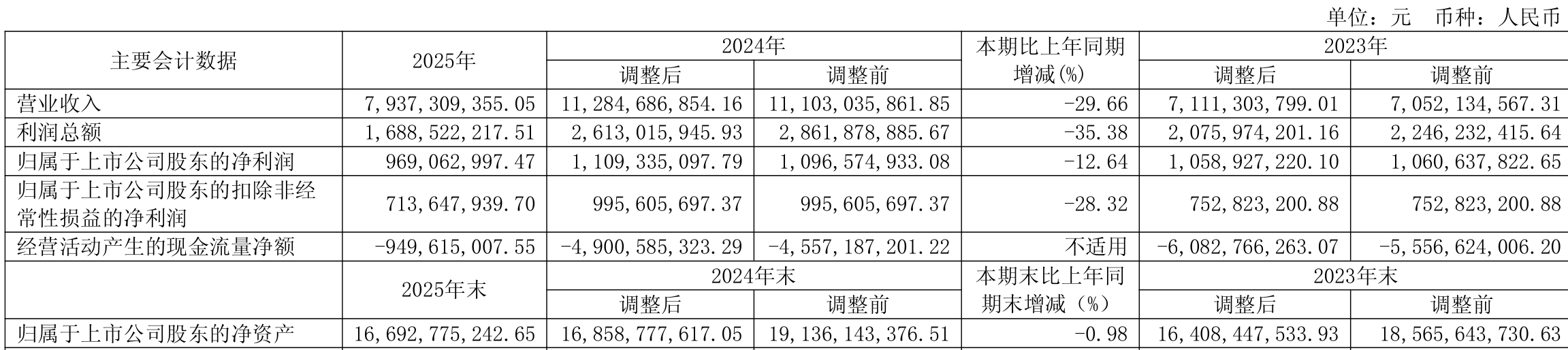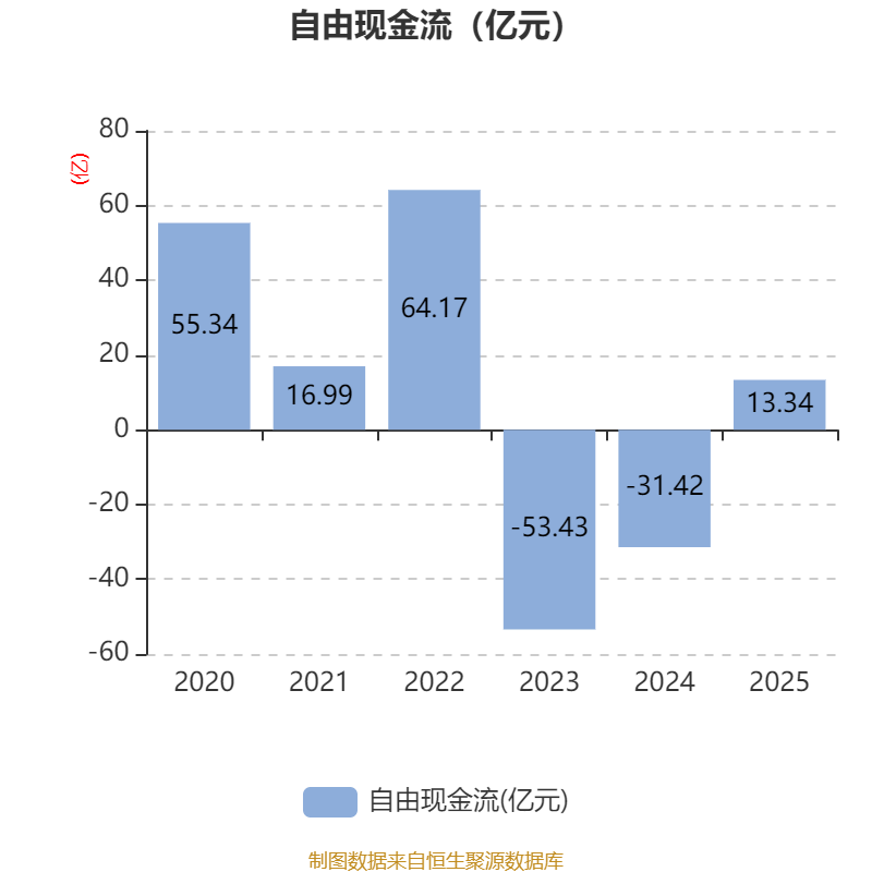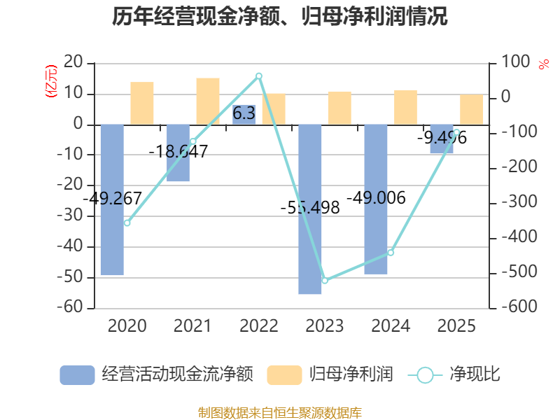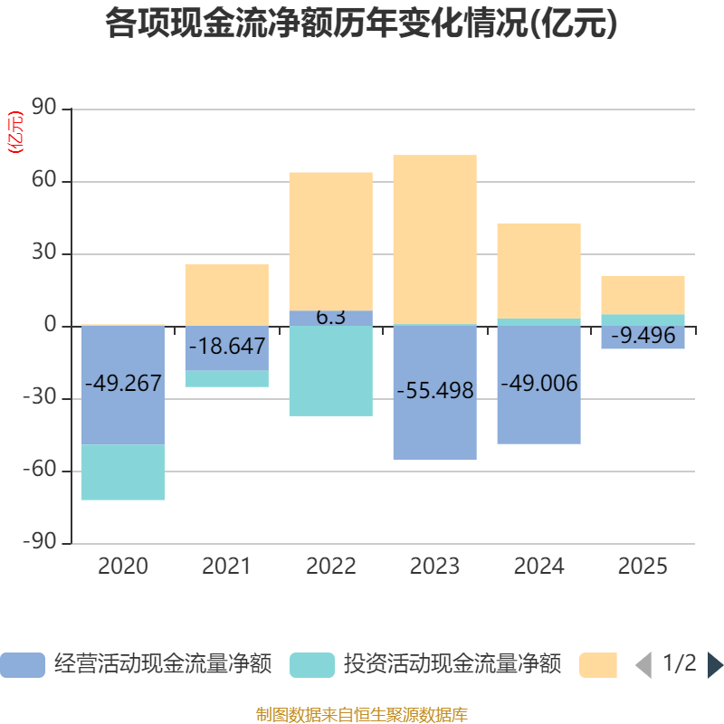截至2025年,公司经营活动现金流净额为-9.5亿元,同比增加39.51亿元;筹资活动现金流净额15.84亿元,同比减少23.47亿元;投资活动现金流净额4.79亿元,上年同期为3.07亿元。