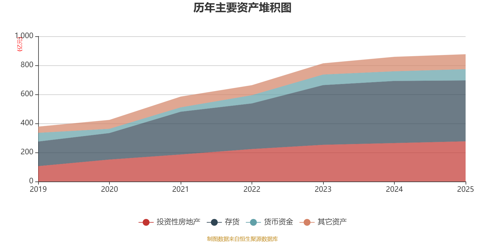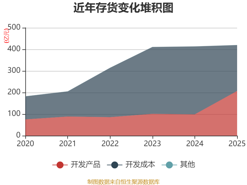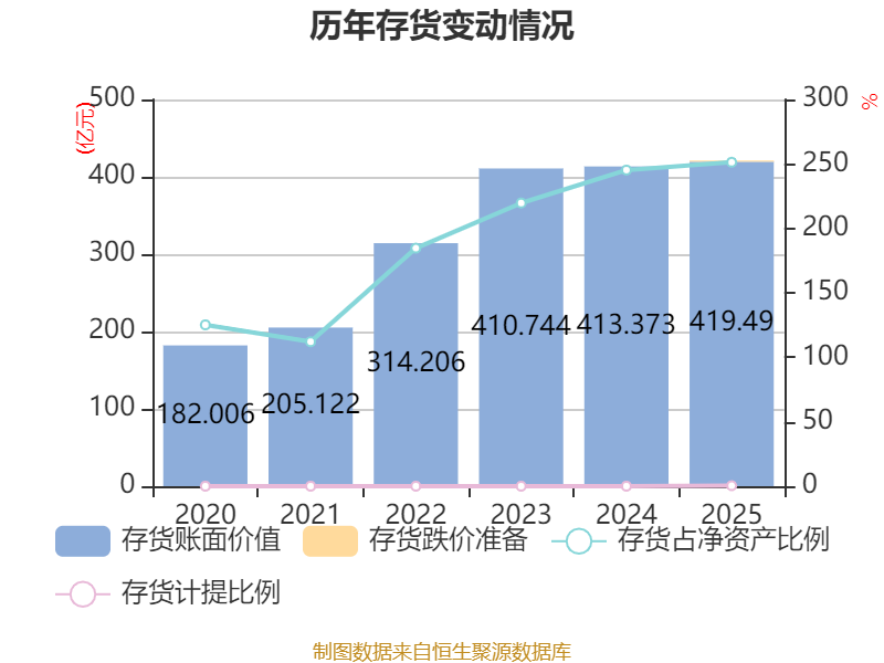 从存货变动来看,截至2025年末,公司存货账面价值为419.49亿元,占净资产的251.3%,较上年末增加6.12亿元。其中,存货跌价准备为1.55亿元,计提比例为0.37%。
