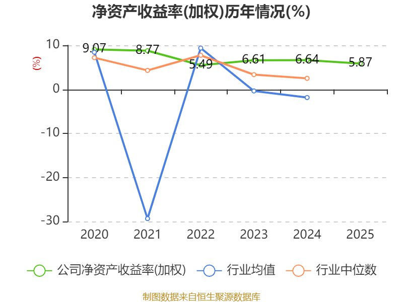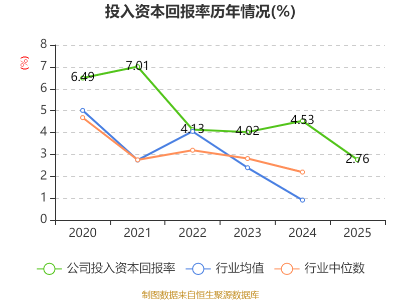 数据显示,2025年公司加权平均净资产收益率为5.87%,较上年同期下降0.77个百分点。公司2025年投入资本回报率为2.76%,较上年同期下降1.77个百分点。