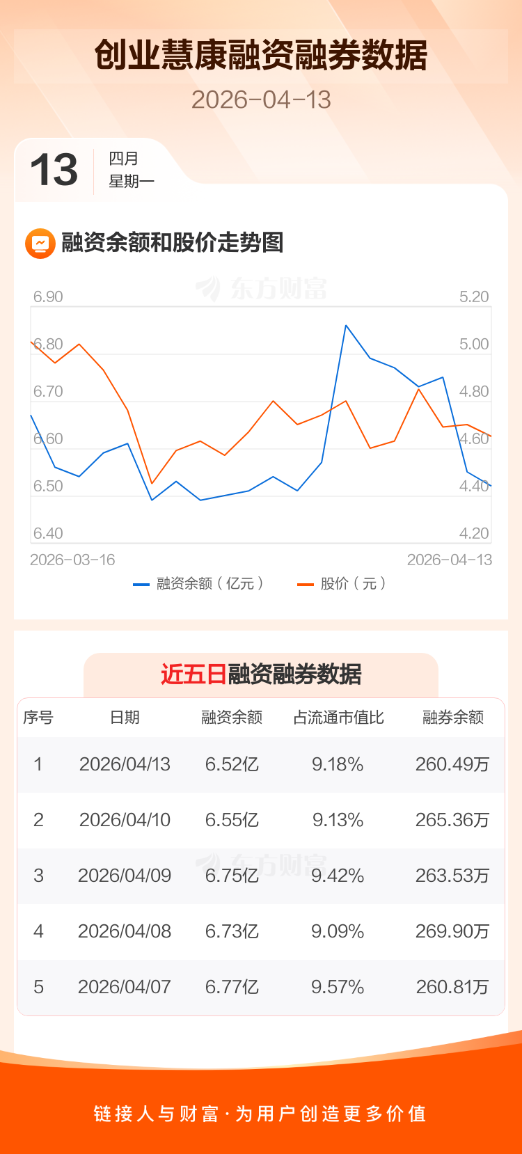 交易所最新数据显示,创业慧康于2026年4月13日获融资买入442.90万元,融资偿还742.38万元,当日融资净偿还299.49万元。目前,该股融资余额6.52亿,占流通市值比例为9.18%。