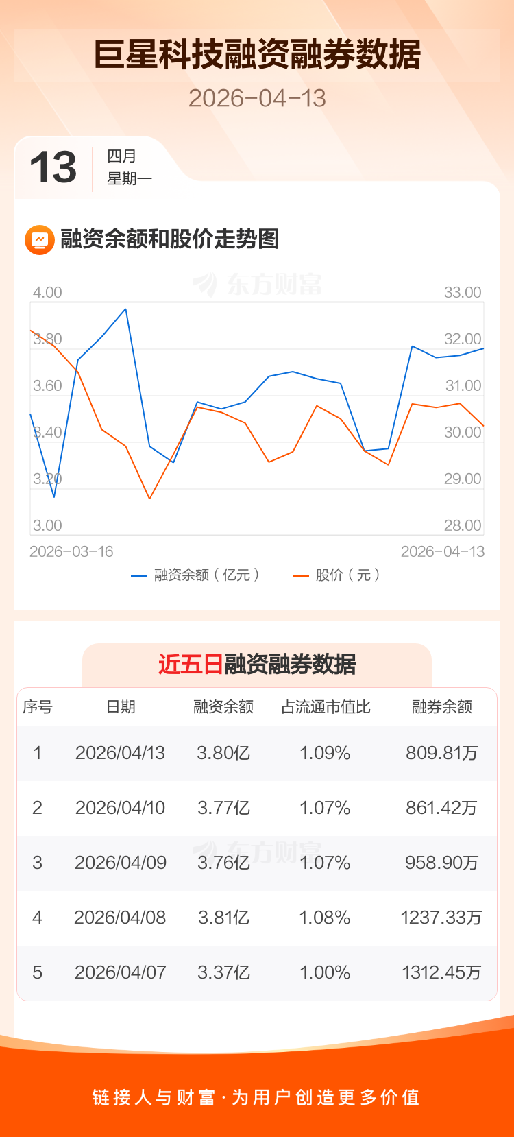 交易所最新数据显示,巨星科技于2026年4月13日获融资买入1891.42万元,融资偿还1550.71万元,当日融资净买入340.71万元。目前,该股融资余额3.80亿,占流通市值比例为1.09%。