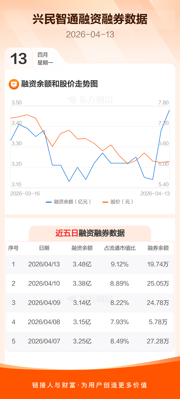 交易所最新数据显示,兴民智通于2026年4月13日获融资买入2407.14万元,融资偿还1372.67万元,当日融资净买入1034.47万元。目前,该股融资余额3.48亿,占流通市值比例为9.12%。