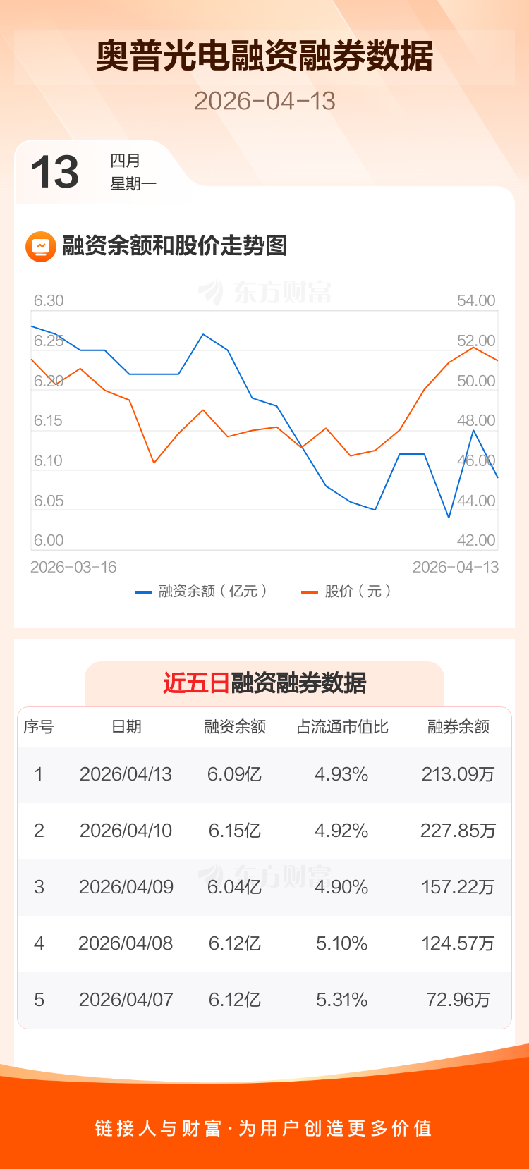 交易所最新数据显示,奥普光电于2026年4月13日获融资买入1129.05万元,融资偿还1756.37万元,当日融资净偿还627.33万元。目前,该股融资余额6.09亿,占流通市值比例为4.93%。