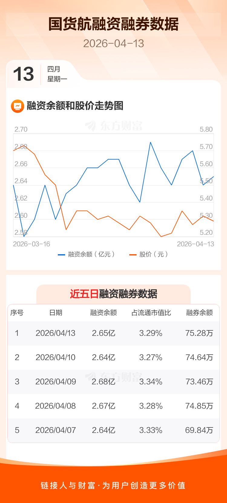 交易所最新数据显示,国货航于2026年4月13日获融资买入380.84万元,融资偿还320.29万元,当日融资净买入60.55万元。目前,该股融资余额2.65亿,占流通市值比例为3.29%。