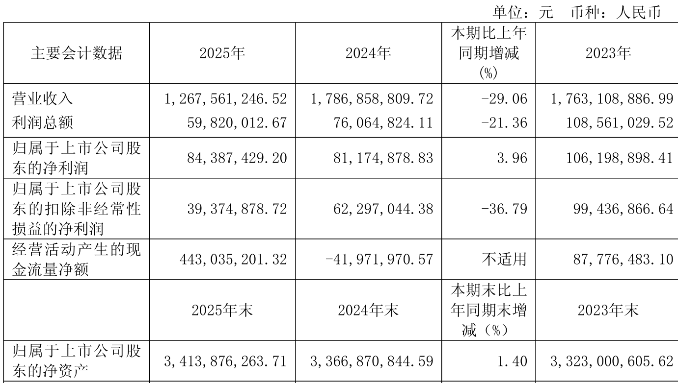 中证智能财讯宁波联合(600051)4月14日披露2025年年度报告。2025年,公司实现营业总收入12.68亿元,同比下降29.06%;归母净利润8438.74万元,同比增长3.96%;扣非净利润3937.49万元,同比下降36.79%;经营活动产生的现金流量净额为4.43亿元,上年同期为-4197.2万元;报告期内,宁波联合基本每股收益为0.27元,加权平均净资产收益率为2.49%。公司2025年度分配预案为:拟向全体股东每10股派现0.6元(含税)。