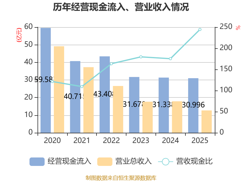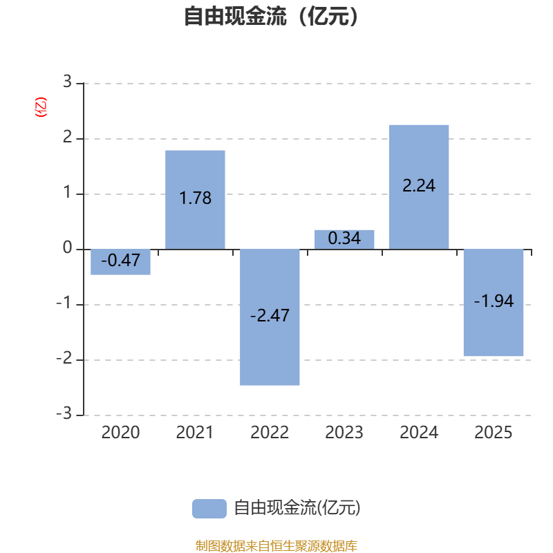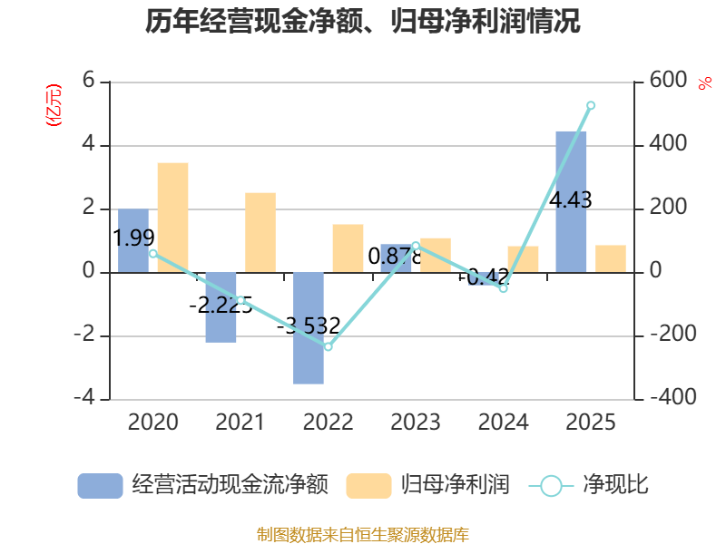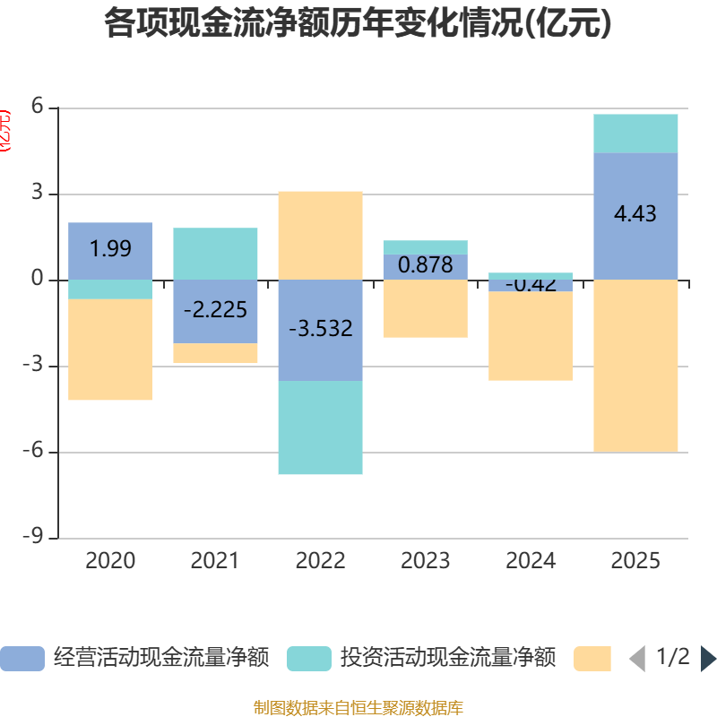 截至2025年,公司经营活动现金流净额为4.43亿元,同比增加4.85亿元;筹资活动现金流净额-6亿元,同比减少2.9亿元;投资活动现金流净额1.34亿元,上年同期为2413.9万元。