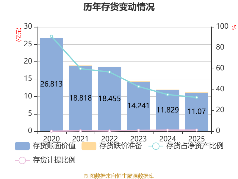从存货变动来看,截至2025年末,公司存货账面价值为11.07亿元,占净资产的32.43%,较上年末减少7590.45万元。其中,存货跌价准备为1312.82万元,计提比例为1.17%。