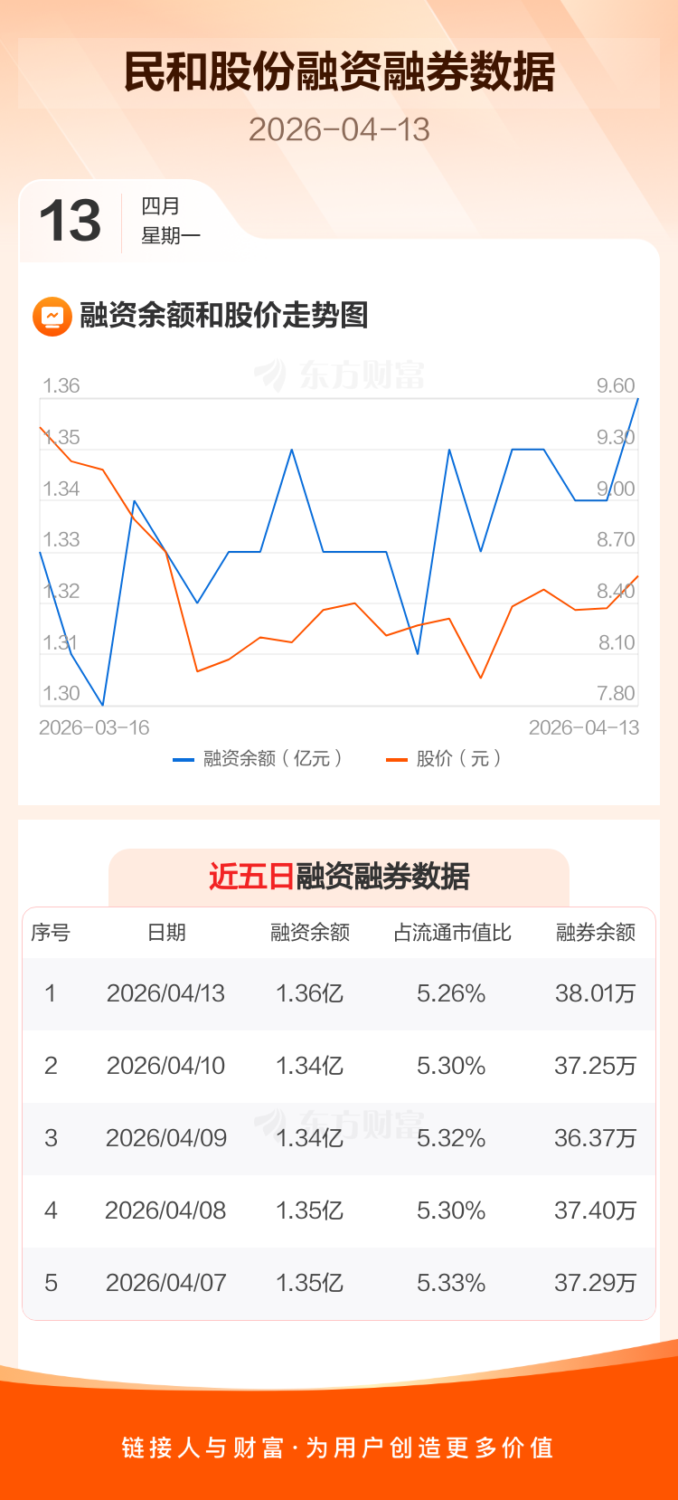 交易所最新数据显示,民和股份于2026年4月13日获融资买入560.83万元,融资偿还369.74万元,当日融资净买入191.1万元。目前,该股融资余额1.36亿,占流通市值比例为5.26%。