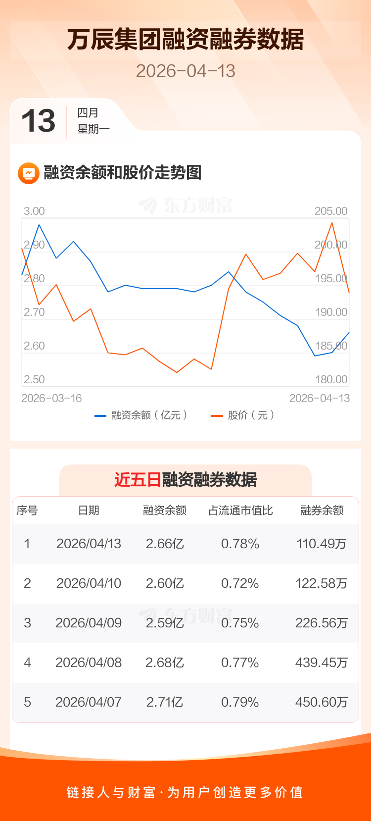 交易所最新数据显示,万辰集团于2026年4月13日获融资买入2052.37万元,融资偿还1427.62万元,当日融资净买入624.75万元。目前,该股融资余额2.66亿,占流通市值比例为0.78%。