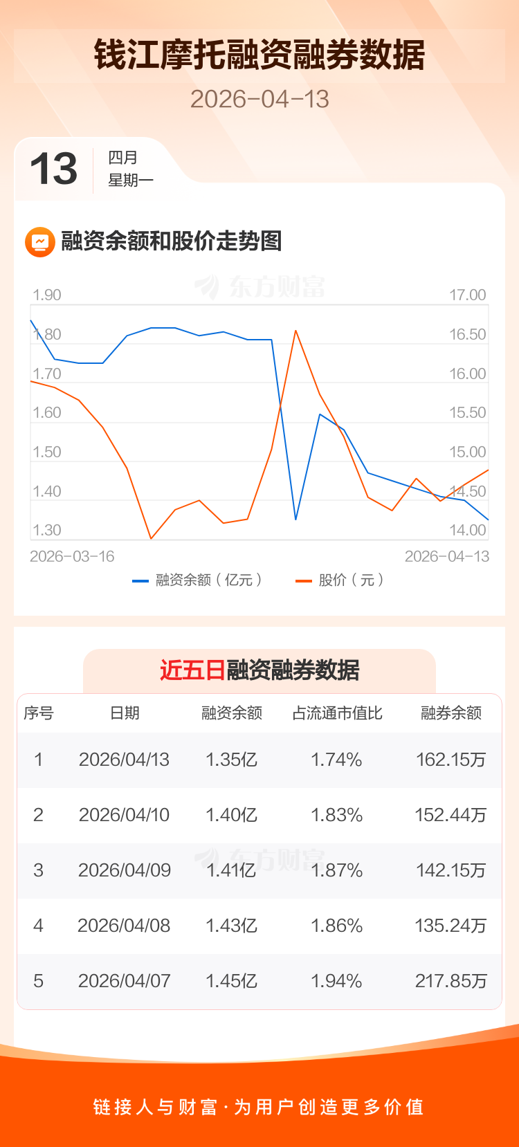交易所最新数据显示,钱江摩托于2026年4月13日获融资买入707.15万元,融资偿还1162.62万元,当日融资净偿还455.46万元。目前,该股融资余额1.35亿,占流通市值比例为1.74%。