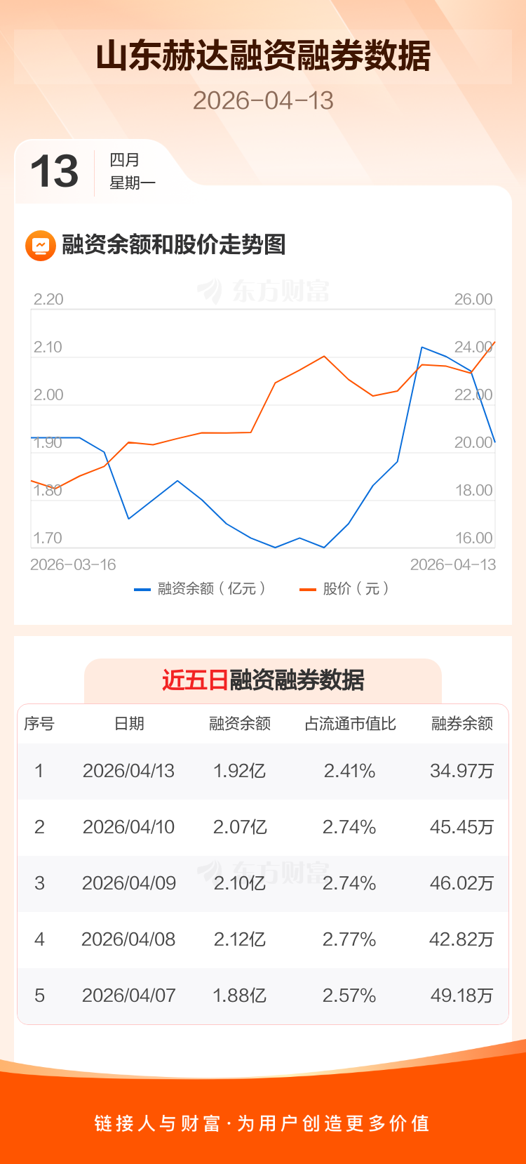 交易所最新数据显示,山东赫达于2026年4月13日获融资买入3030.32万元,融资偿还4509.06万元,当日融资净偿还1478.74万元。目前,该股融资余额1.92亿,占流通市值比例为2.41%。