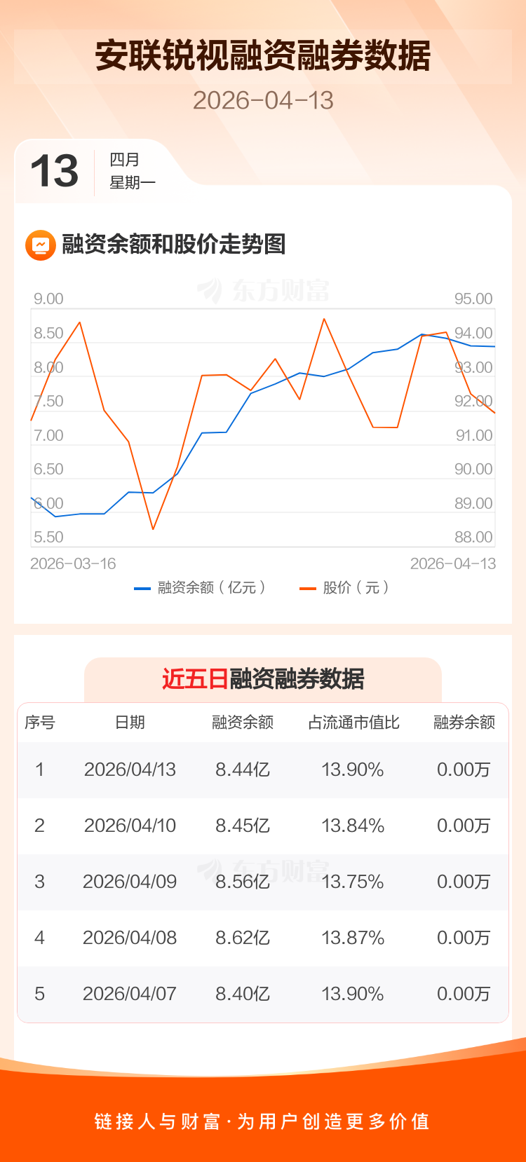 交易所最新数据显示,安联锐视于2026年4月13日获融资买入883.05万元,融资偿还1044.09万元,当日融资净偿还161.04万元。目前,该股融资余额8.44亿,占流通市值比例为13.90%。