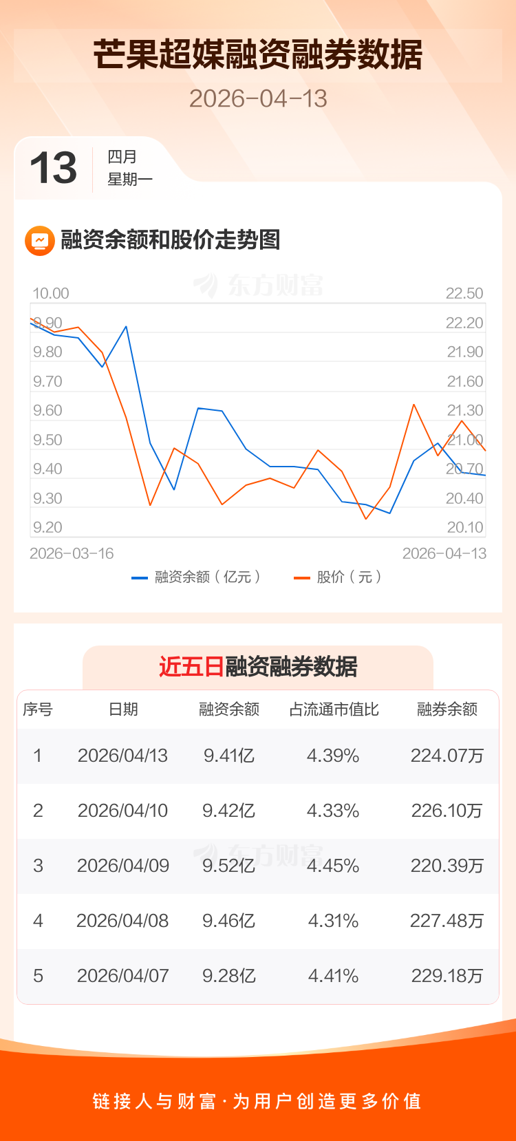 交易所最新数据显示,芒果超媒于2026年4月13日获融资买入2641.64万元,融资偿还2784.84万元,当日融资净偿还143.2万元。目前,该股融资余额9.41亿,占流通市值比例为4.39%。