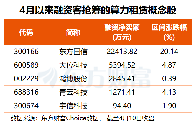 从资金角度看,东方财富Choice数据显示,4月以来,有5只算力租赁概念股获得融资净买入,东方国信获杠杆资金加仓2.24亿元,大位科技获融资客抢筹5394.52万元,鸿博股份、青云科技融资净买额分别为2845.41万、1271.41万元。