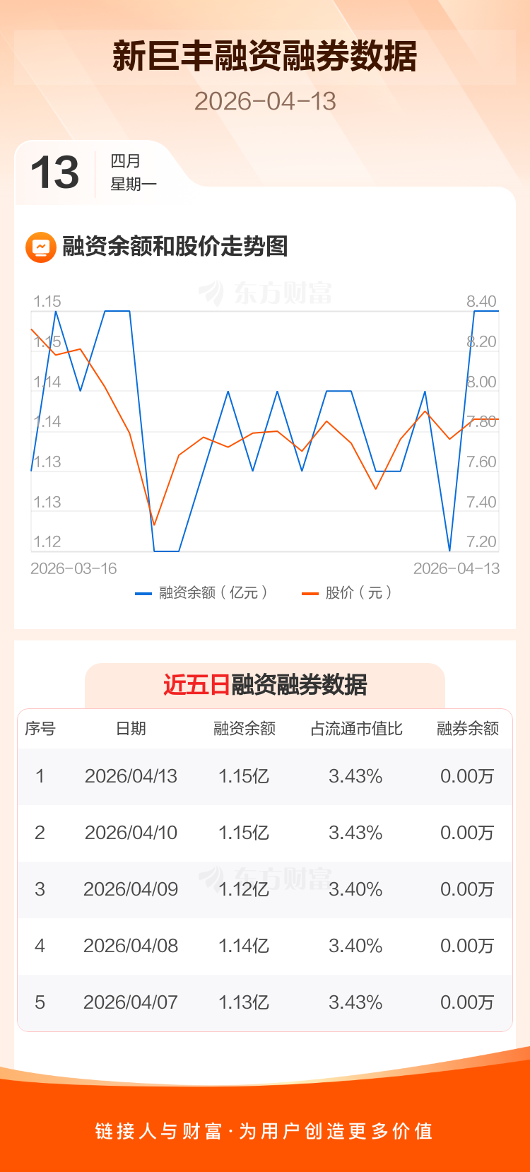 交易所最新数据显示,新巨丰于2026年4月13日获融资买入166.58万元,融资偿还170.06万元,当日融资净偿还3.48万元。目前,该股融资余额1.15亿,占流通市值比例为3.43%。