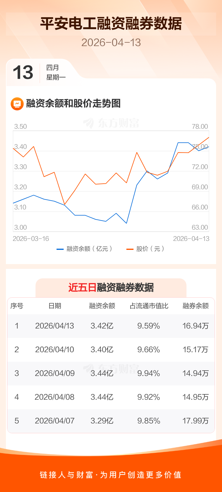 交易所最新数据显示,平安电工于2026年4月13日获融资买入2384.88万元,融资偿还2125.04万元,当日融资净买入259.84万元。目前,该股融资余额3.42亿,占流通市值比例为9.59%。