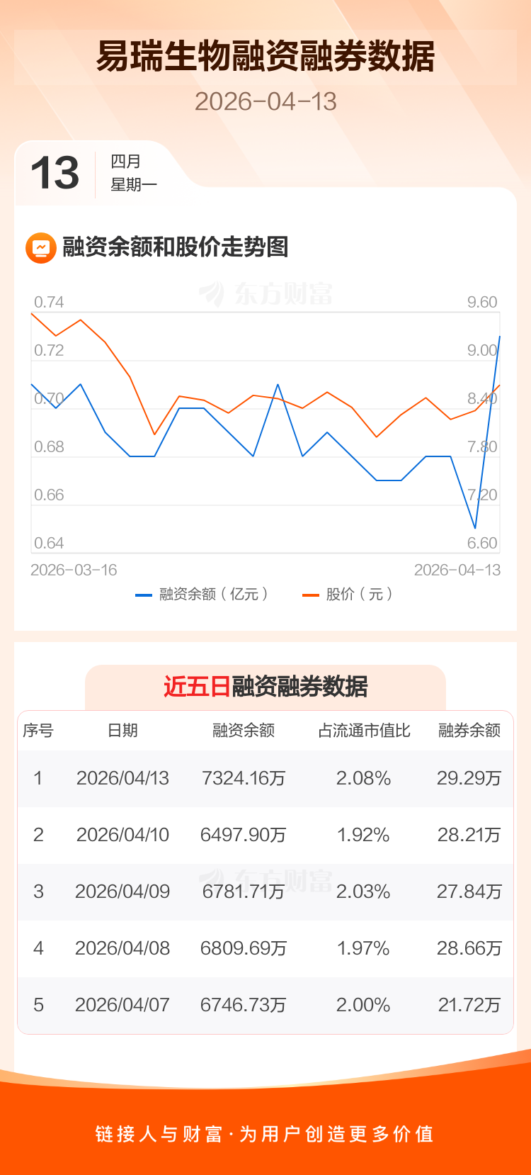 交易所最新数据显示,易瑞生物于2026年4月13日获融资买入1522.65万元,融资偿还696.39万元,当日融资净买入826.26万元。目前,该股融资余额7324.16万,占流通市值比例为2.08%。