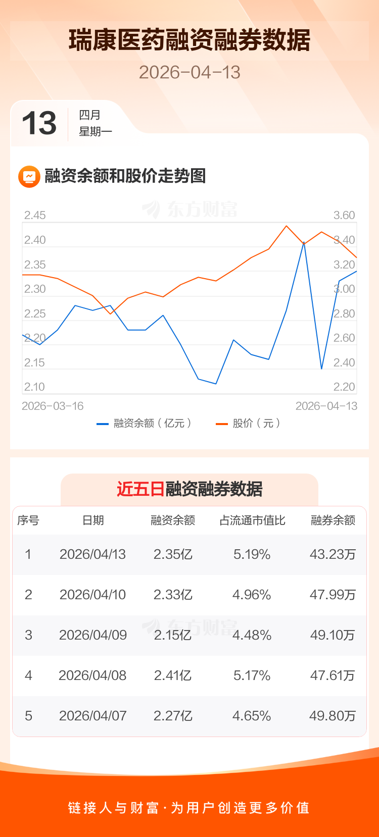 交易所最新数据显示,瑞康医药于2026年4月13日获融资买入2443.07万元,融资偿还2277.33万元,当日融资净买入165.74万元。目前,该股融资余额2.35亿,占流通市值比例为5.19%。