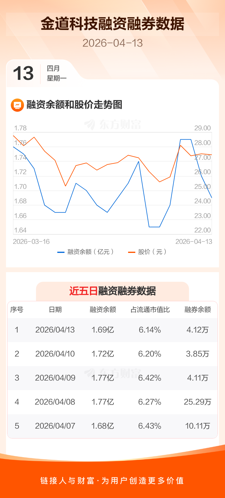 交易所最新数据显示,金道科技于2026年4月13日获融资买入379.62万元,融资偿还589.97万元,当日融资净偿还210.36万元。目前,该股融资余额1.69亿,占流通市值比例为6.14%。