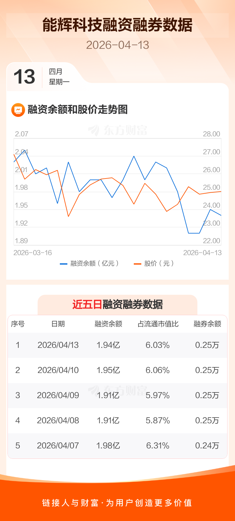 交易所最新数据显示,能辉科技于2026年4月13日获融资买入489.44万元,融资偿还526.06万元,当日融资净偿还36.63万元。目前,该股融资余额1.94亿,占流通市值比例为6.03%。