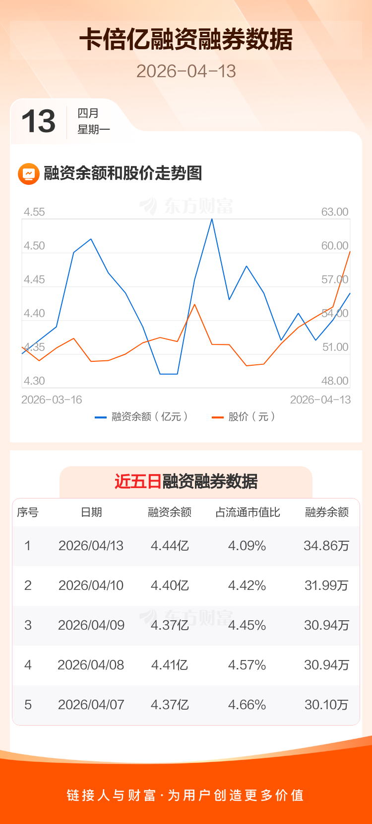交易所最新数据显示,卡倍亿于2026年4月13日获融资买入6767.80万元,融资偿还6394.29万元,当日融资净买入373.51万元。目前,该股融资余额4.44亿,占流通市值比例为4.09%。