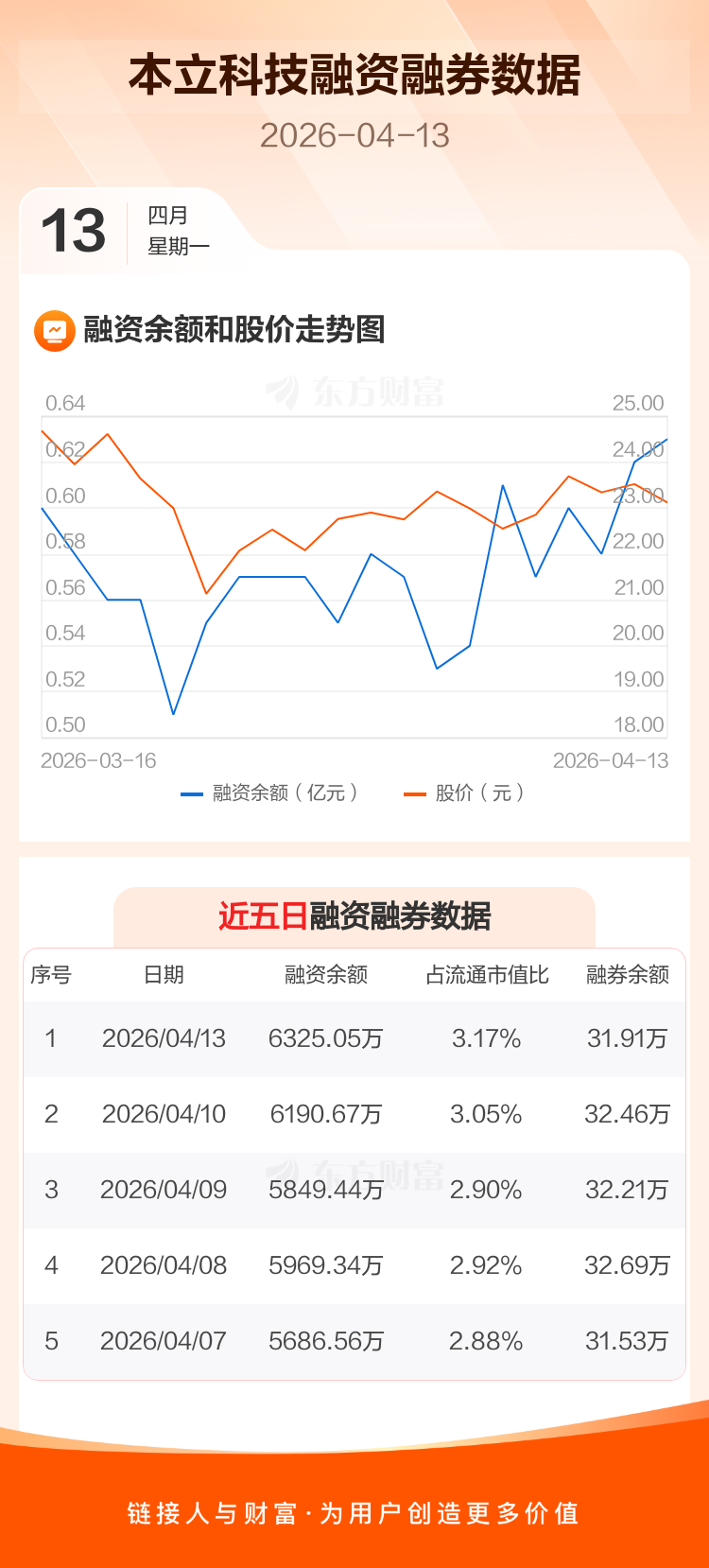 交易所最新数据显示,本立科技于2026年4月13日获融资买入323.13万元,融资偿还188.75万元,当日融资净买入134.38万元。目前,该股融资余额6325.05万,占流通市值比例为3.17%。