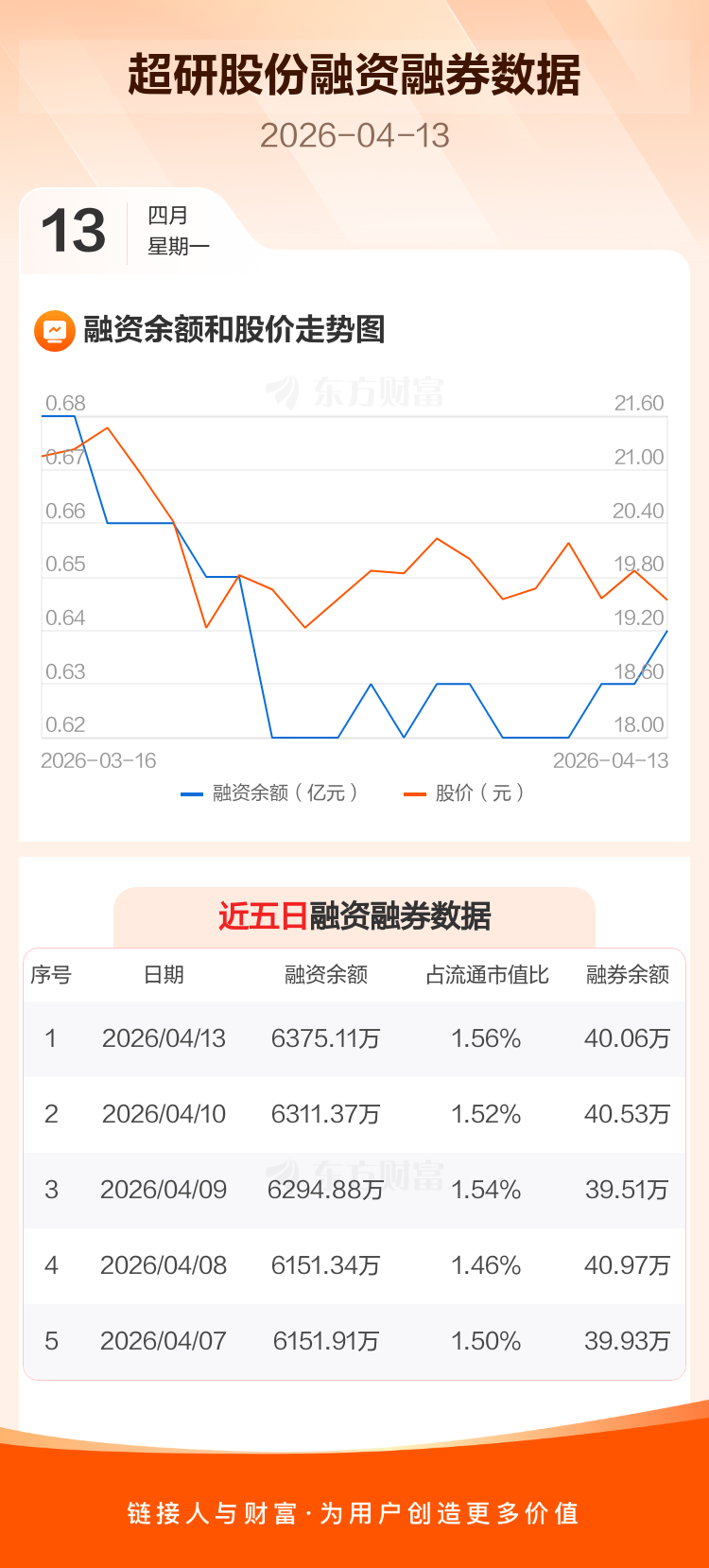 交易所最新数据显示,超研股份于2026年4月13日获融资买入189.96万元,融资偿还126.21万元,当日融资净买入63.75万元。目前,该股融资余额6375.11万,占流通市值比例为1.56%。
