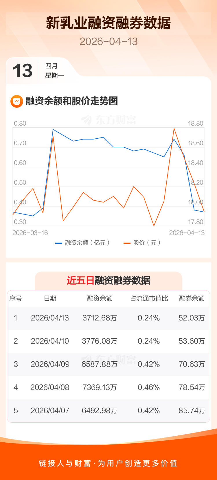 交易所最新数据显示,新乳业于2026年4月13日获融资买入1108.52万元,融资偿还1171.92万元,当日融资净偿还63.41万元。目前,该股融资余额3712.68万,占流通市值比例为0.24%。