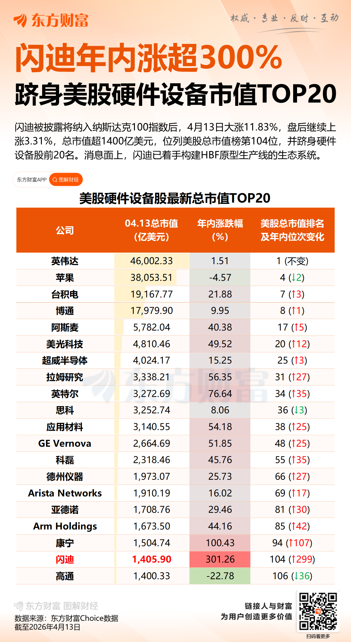闪迪年内涨超300%跻身美股硬件市值TOP20 一图速览硬件设备最新市值榜