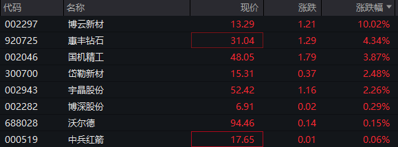 【大河财立方消息】4月14日,超硬材料指数盘中大涨,博云新材涨停,惠丰钻石盘中一度涨超10%。截至发稿,国机精工涨3.87%,惠丰钻石涨4.34%,岱勒新材涨2.48%。