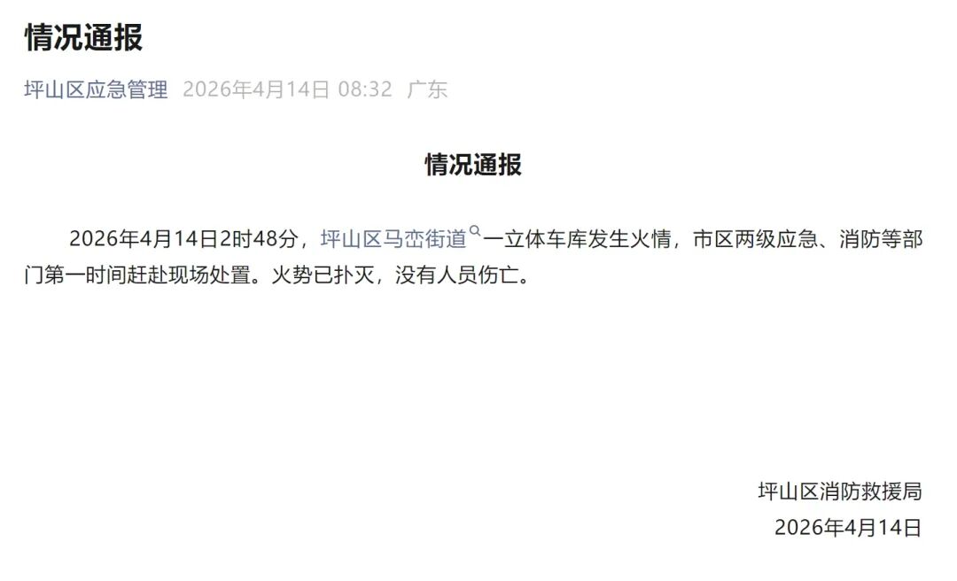 此前,深圳坪山区消防救援局发文称:2026年4月14日2时48分,坪山区马峦街道一立体车库发生火情,市区两级应急、消防等部门第一时间赶赴现场处置。火势已扑灭,没有人员伤亡。
