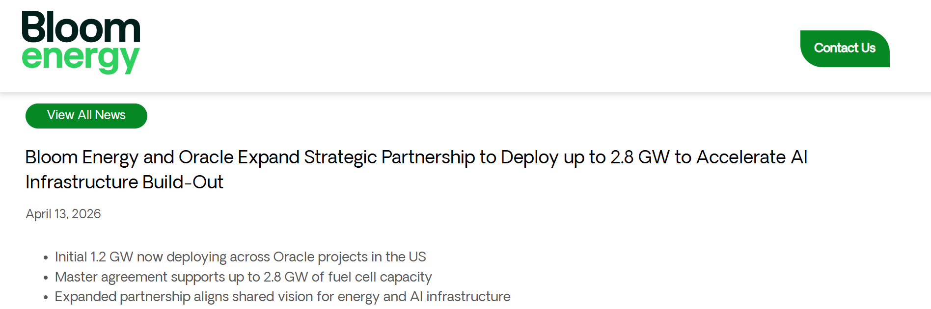 美东时间周一盘后,燃料电池制造商Bloom Energy宣布其又拿下大单:Bloom Energy将与甲骨文扩大合作伙伴关系,以支持其人工智能和云计算基础设施的快速建设。根据协议,甲骨文打算采购多达2.8吉瓦(GW)的 Bloom 燃料电池系统。
