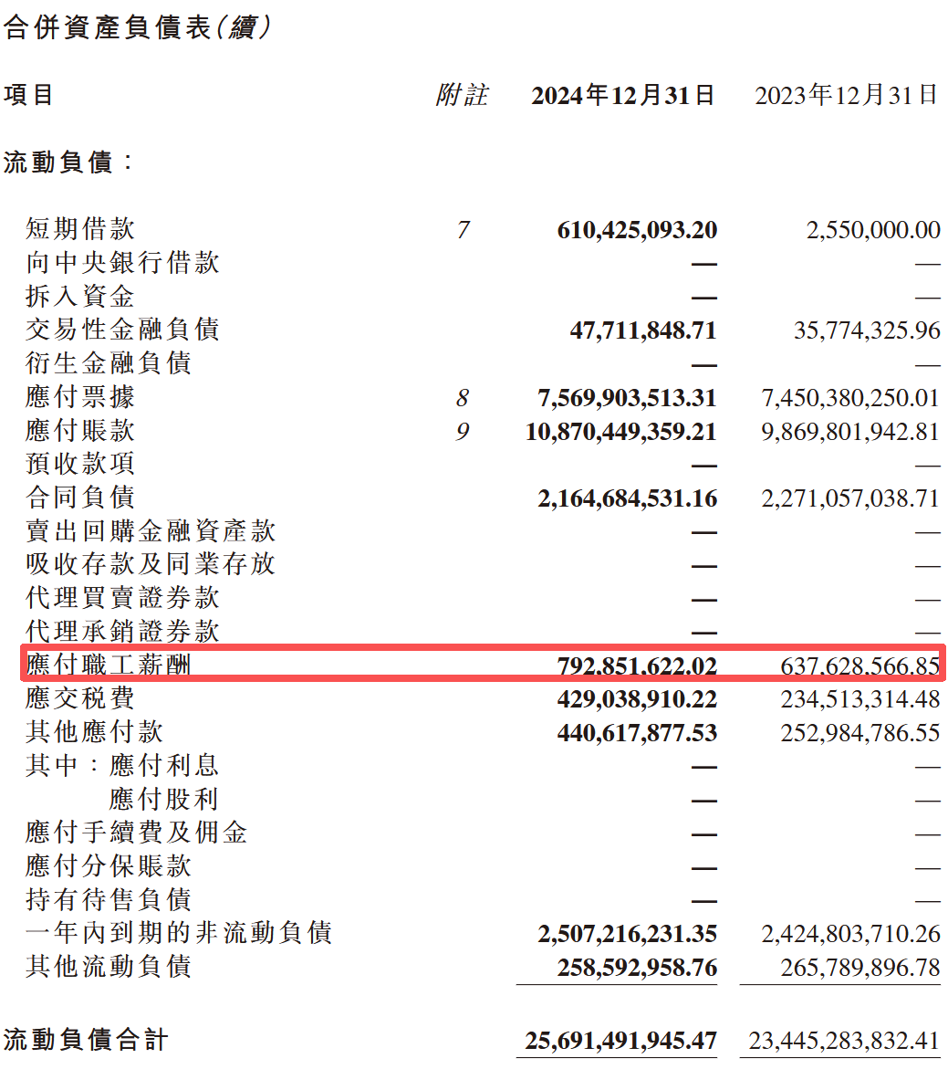 这笔涉及近亿元的未决诉讼,其在新特能源财务报表中的确认方式,是专业审计机构评估其财务规范性的核心焦点。《财中社》发现,根据新特能源披露的业绩公告,“应付职工薪酬”科目在2024年末约为7.93亿元,较上年末增长了约1.55亿元;然而到了2025年末,该余额明显下降至6.77亿元,调减规模达1.16亿元。