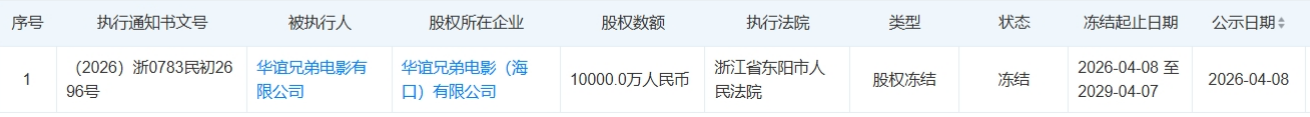 上证报中国证券网讯(记者杨翔菲)记者4月14日从天眼查App获悉,近日,华谊兄弟电影有限公司新增一则股权冻结信息,股权所在企业为华谊兄弟电影(海口)有限公司,冻结股权数额1亿元,执行法院为浙江省东阳市人民法院。
