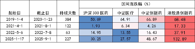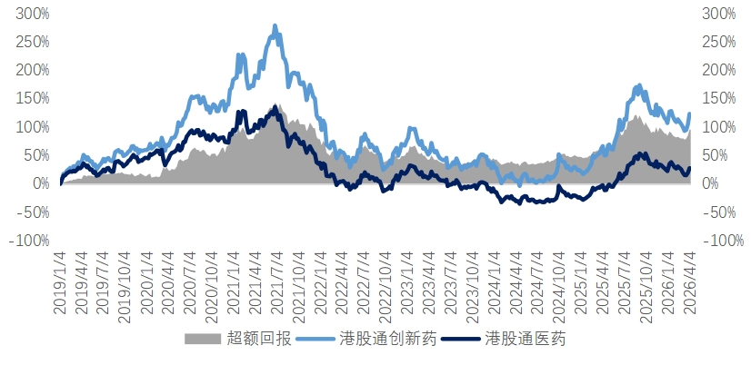 回顾过去,港股通创新药相比港股通医药的超额行情,均由"创新突破+出海兑现"驱动,超额集中发生在两个阶段: