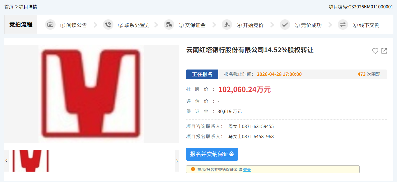 4月14日消息,昆明联合产权交易平台显示,云南红塔银行股份有限公司14.52%股权挂牌转让,涉及股份9.1455亿股,转让方为昆明产业开发投资有限责任公司,挂牌价格10.21亿元。