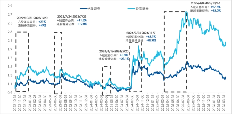 估值优势:中证香港证券投资主题指数(930709.CSI)的市净率(最新报告期)约为0.85倍,显著低于A股的证券公司指数(399975.SZ)1.18倍的水平。