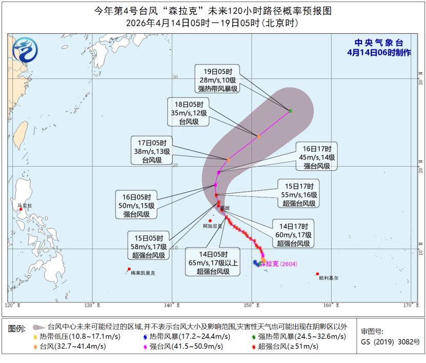 今年第4号台风“森拉克”(超强台风级)的中心今天(14日)早晨5点钟位于美国关岛东偏北方向约225公里的西北太平洋洋面上,就是北纬13.9度、东经146.8度,中心附近最大风力有17级以上(65米/秒),中心最低气压为910百帕,七级风圈半径为450-500公里,十级风圈半径为120-160公里,十二级风圈半径为80公里。