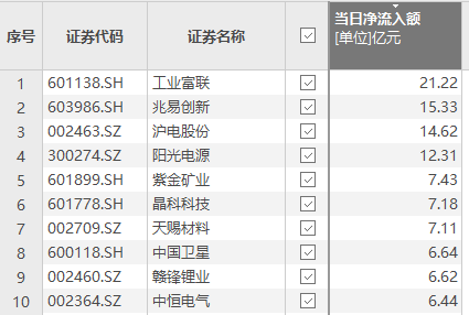 Choice数据显示,4月14日,资金净流入额排名前十的个股依次是工业富联、兆易创新、沪电股份、阳光电源、紫金矿业、晶科科技、天赐材料、中国卫星、赣锋锂业、中恒电气。其中,工业富联获净流入21.22亿元。