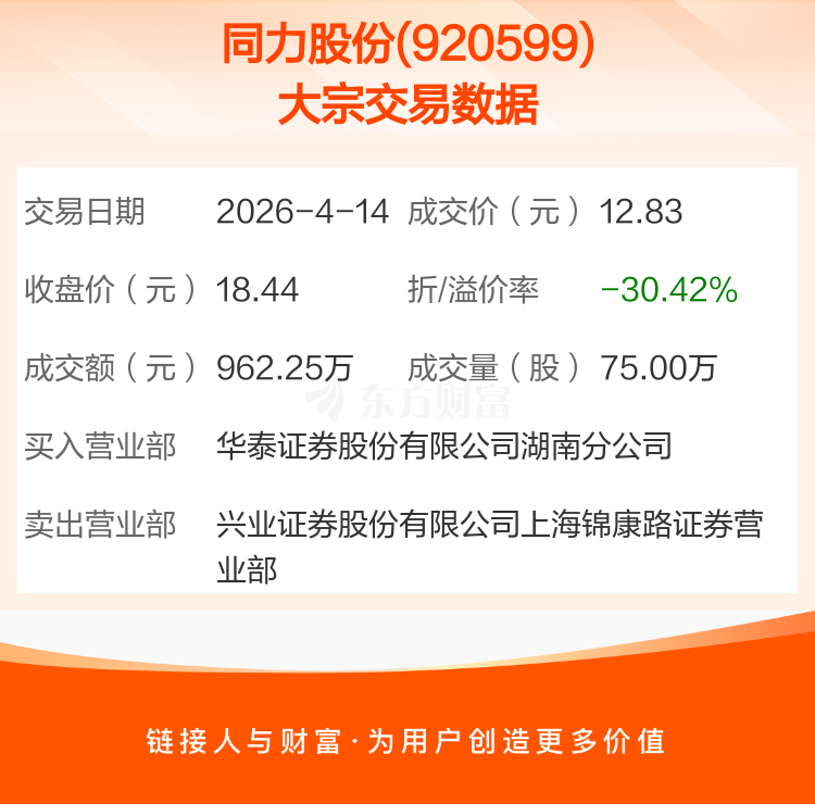 2026年4月14日,同力股份发生1笔大宗交易,共成交75.00万股,成交金额962.25万元,占其流通市值比例为0.15%。