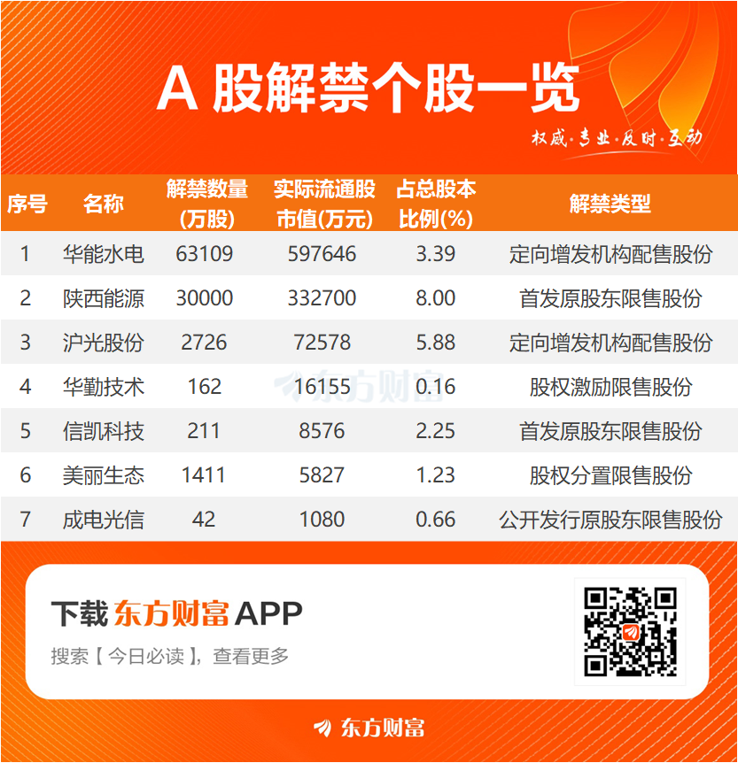 从解禁市值看,东方财富Choice数据显示,明日面临解禁的7只股票中,华能水电、陕西能源、沪光股份居前,解禁市值分别为59.76亿元、33.27亿元、7.26亿元。解禁比例方面,陕西能源、沪光股份、华能水电分别为8.00%、5.88%、3.39%,居于前列。