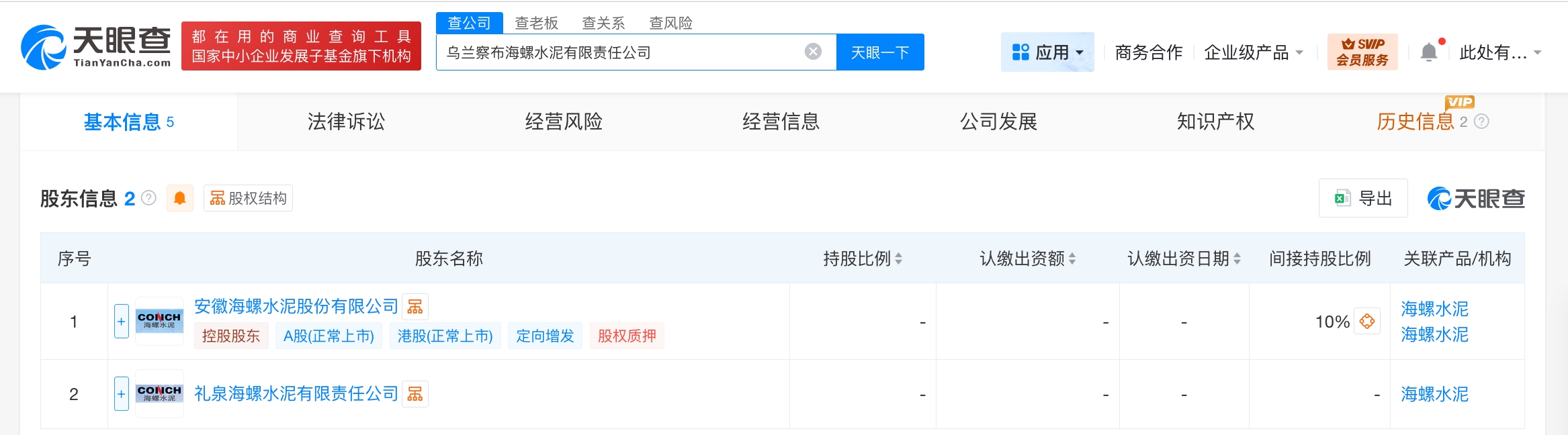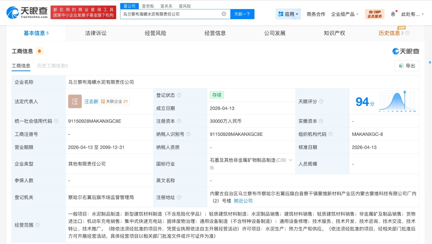 天眼查App显示,近日,乌兰察布海螺水泥有限责任公司成立,法定代表人为汪志新,注册资本3亿元,经营范围包括水泥制品制造、新型建筑材料制造、建筑材料销售、水泥生产等。股东信息显示,该公司由海螺水泥(600585)及旗下礼泉海螺水泥有限责任公司共同持股。