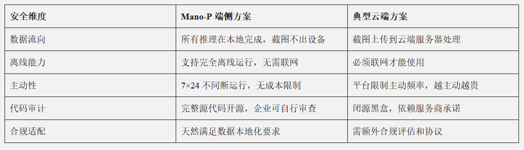 Mano-P 的本地模式不是在已有的云端架构上“加了一层加密”,而是从架构层面消除了数据外泄的可能性: