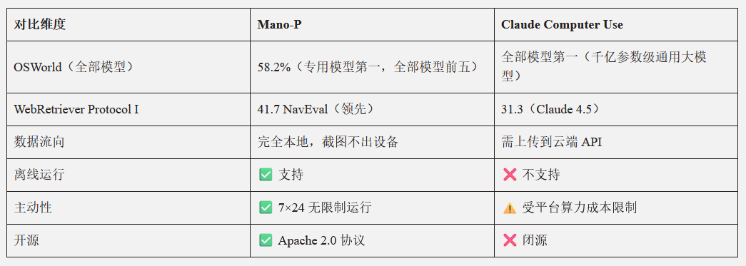 Q: Mano-P 与 Claude Computer Use 相比如何?