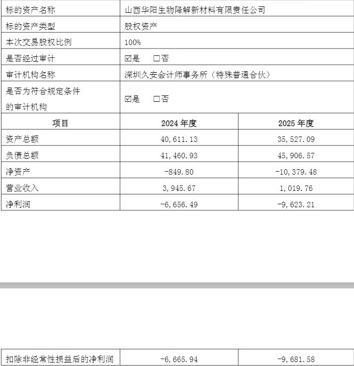 显然,华阳新材在生物降解新材料业务上遭遇了重大投资失败,数亿元投资打水漂。数据显示,其核心运营主体生物新材公司在2024年和2025年合计亏损超过1.6亿元。最终,这项被寄予厚望的业务以资不抵债告终,公司不得不以1元的价格将其剥离。