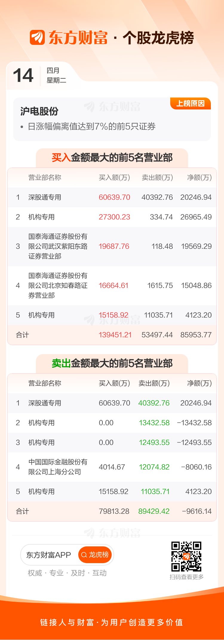 交易所2026年4月14日公布的交易公开信息显示,沪电股份因成为日涨幅偏离值达到7%的前5只证券上榜。沪电股份当日收报97.54元,涨跌幅10.00%,偏离值8.58%,换手率4.88%,成交额89.99亿。