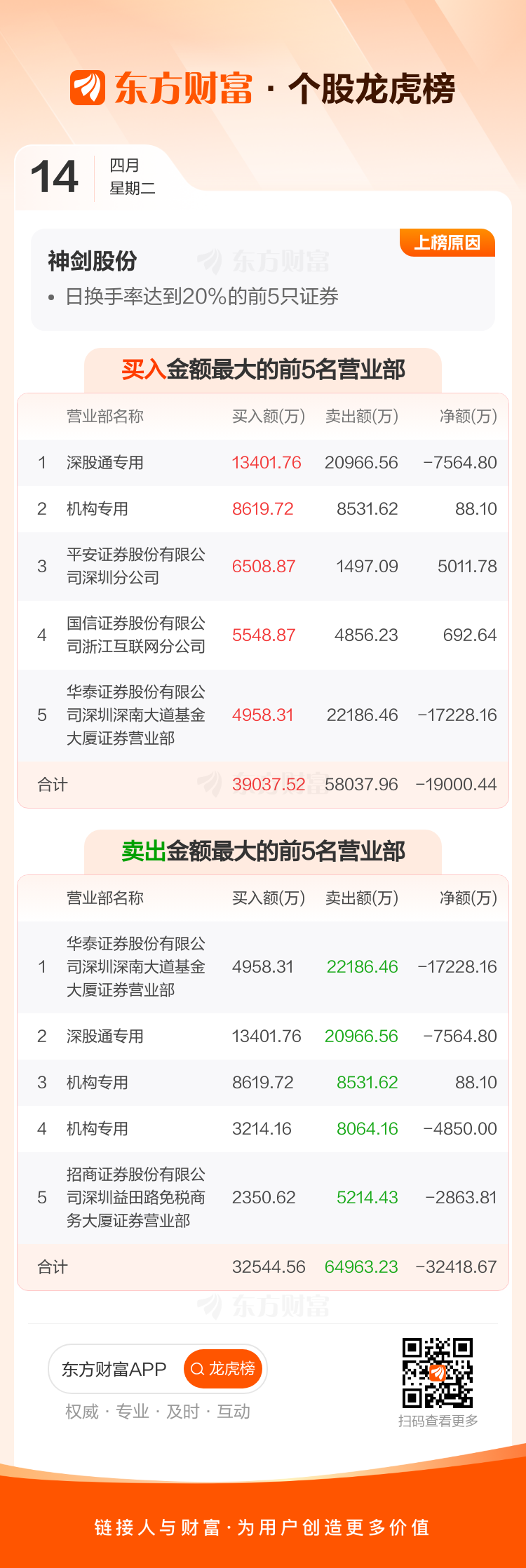交易所2026年4月14日公布的交易公开信息显示,神剑股份因成为日换手率达到20%的前5只证券上榜。神剑股份当日收报16.85元,涨跌幅0.90%,偏离值32.63%,换手率34.06%,成交额46.00亿。