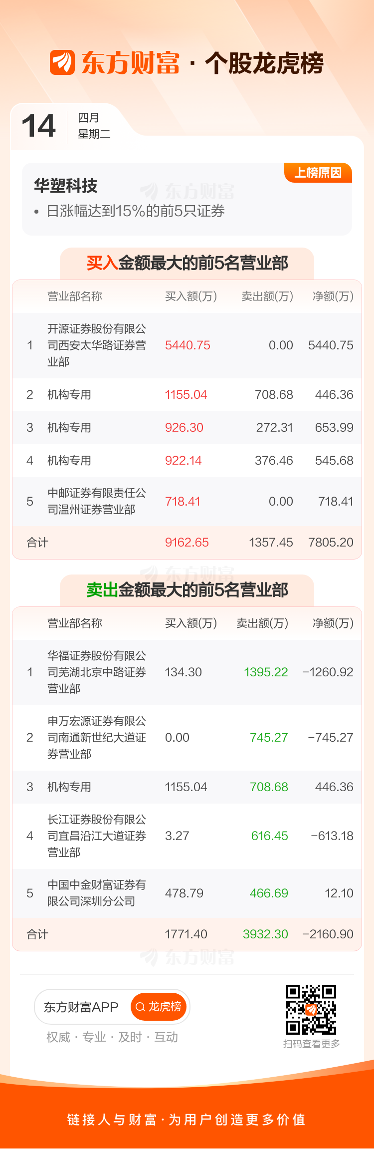 交易所2026年4月14日公布的交易公开信息显示,华塑科技因成为日涨幅达到15%的前5只证券上榜。华塑科技当日收报77.7元,涨跌幅20.00%,偏离值20.00%,换手率24.18%,成交额3.52亿。