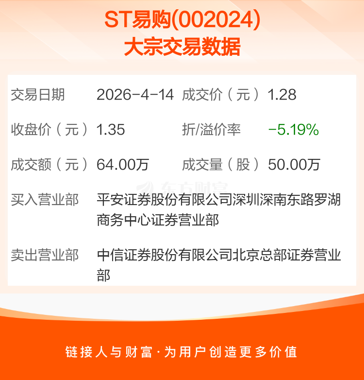 2026年4月14日,ST易购发生1笔大宗交易,共成交50.00万股,成交金额64.00万元。